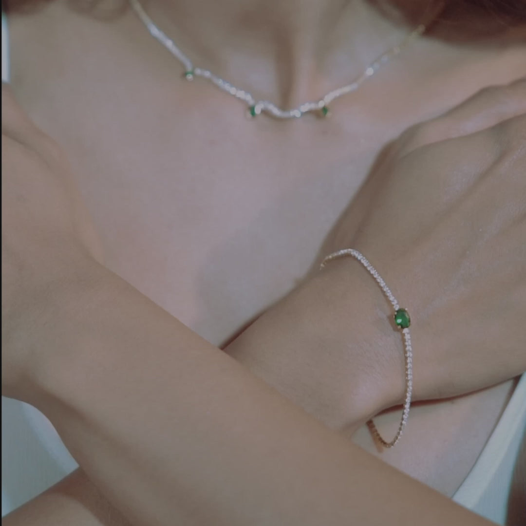 Introducing our "Emerald Empress Bracelet" – a magnificent symbol of luxury and celebration. This stunning bracelet features emeralds encircled by radiant white zircon stones, crafting a breathtaking display of opulence. Meticulously crafted from premium 925 sterling silver and adorned with an impeccable 18k electroplated gold finish, it radiates unparalleled sophistication and elegance. This bracelet will go perfectly with our Emerald Empress Necklace & Earrings set.